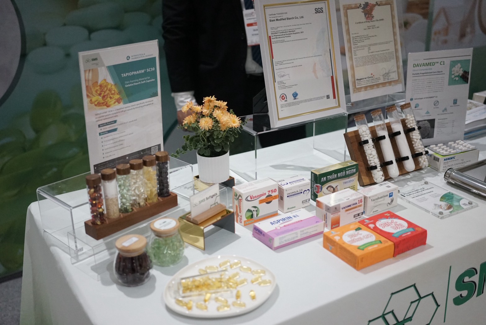 At the event, SMS presented its pharmaceutical- and nutraceutical-grade modified tapioca starch solutions, including the DAVAMED™ series–certified under EXCiPACT and TAPIOPARM™ series. These products are developed to meet stringent pharmaceutical standards and are designed to support high-performance drug formulation applications.